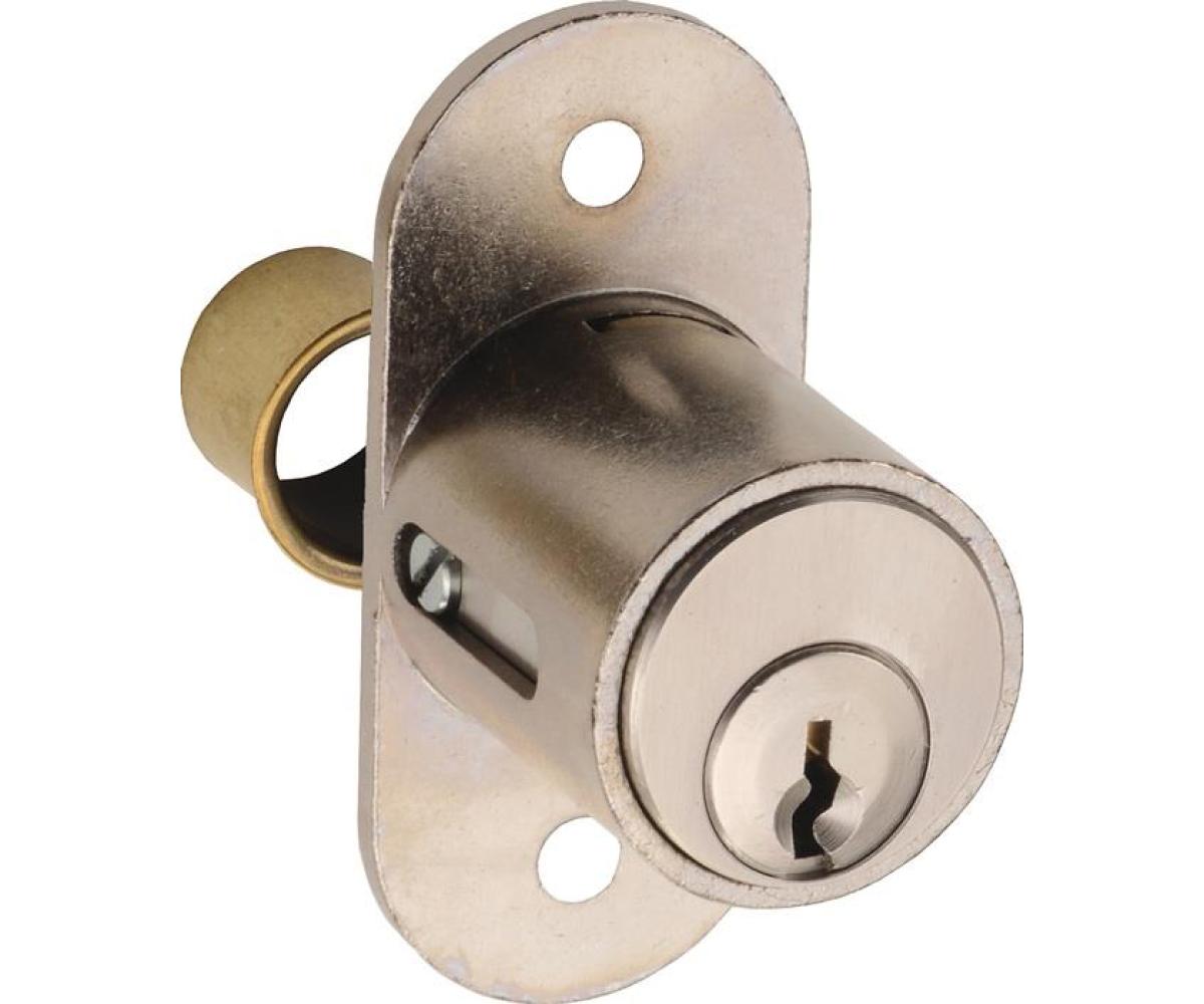 Druckzylinder · ohne Schließzwang · mit Stiftzuhaltungen · Zylinder Messing vernickelt · 23,5 mm lang, ø 19 mm, Hub 12 mm · Halteplatte und Gehäuse Metall vernickelt · Schließhülse Messing roh · 2 Schlüssel · 1 Rosette Messing vernickelt