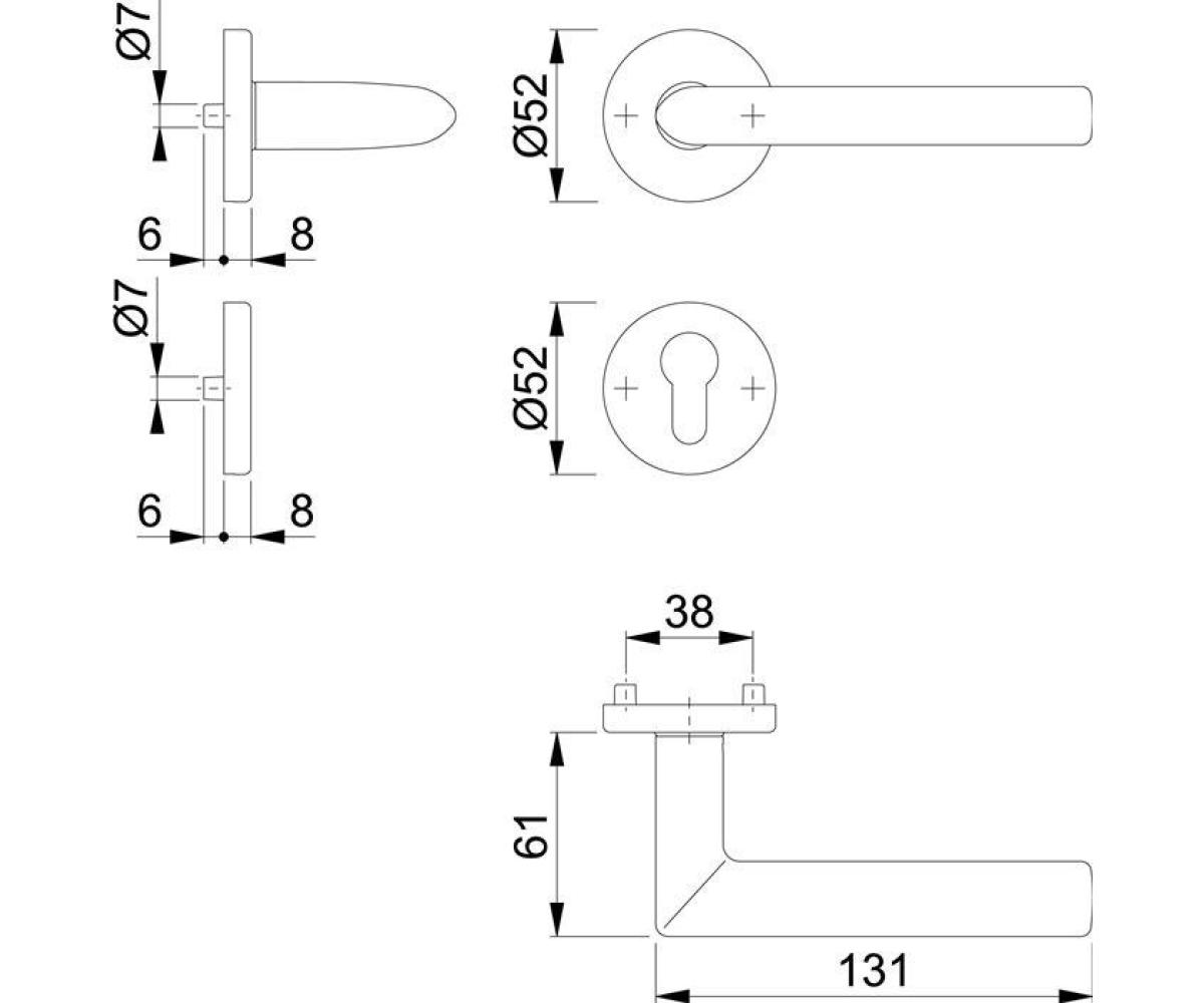Innentür-Rosetten-Garnitur geprüft nach DIN EN 1906 (Gebrauchs-Kategorie Klasse 3) · Türgriffe mit Schnellstift-Verbindung (mit 8 mm Vollstift) für Türstärke 37-42 mm und Rückholfeder · Rosetten mit Stütznocken unsichtbar verschraubt · Drückerlänge bei Aluminium 132 mm, bei Edelstahl 131 mm · Anschlagrichtung DIN links / rechts