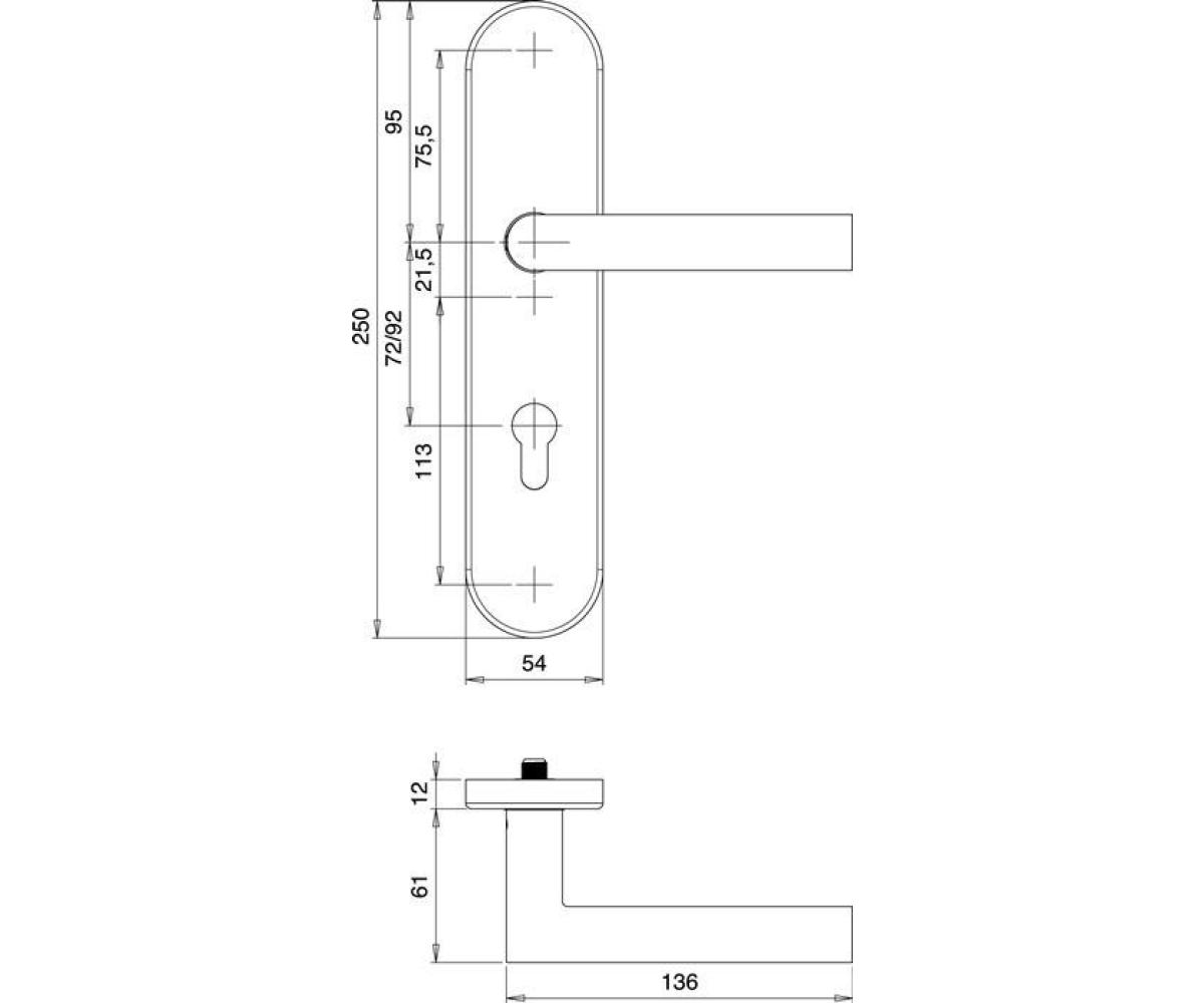 Weitere technische Eigenschaften · Breite: 54mm · Länge: 250mm · Abdeckung: ohne Zylinderabdeckung · Schildstärke: 12 mm · Schutzgarnitur Logo · 8743/7203 Alu.F1 72mm · 35-45mm EDI ·