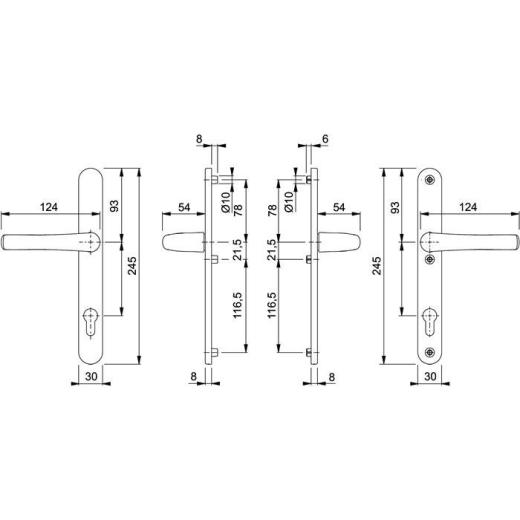 Drückergarnitur für Profiltüren · fest/drehbar gelagert · Schilder mit Edelstahl-Unterkonstruktion und Stütznocken · außen: nicht sichtbar verschraubt · innen: sichtbare Verschraubung M6 · Entfernung 92 mm · Vierkant 8 mm · DIN links / rechts